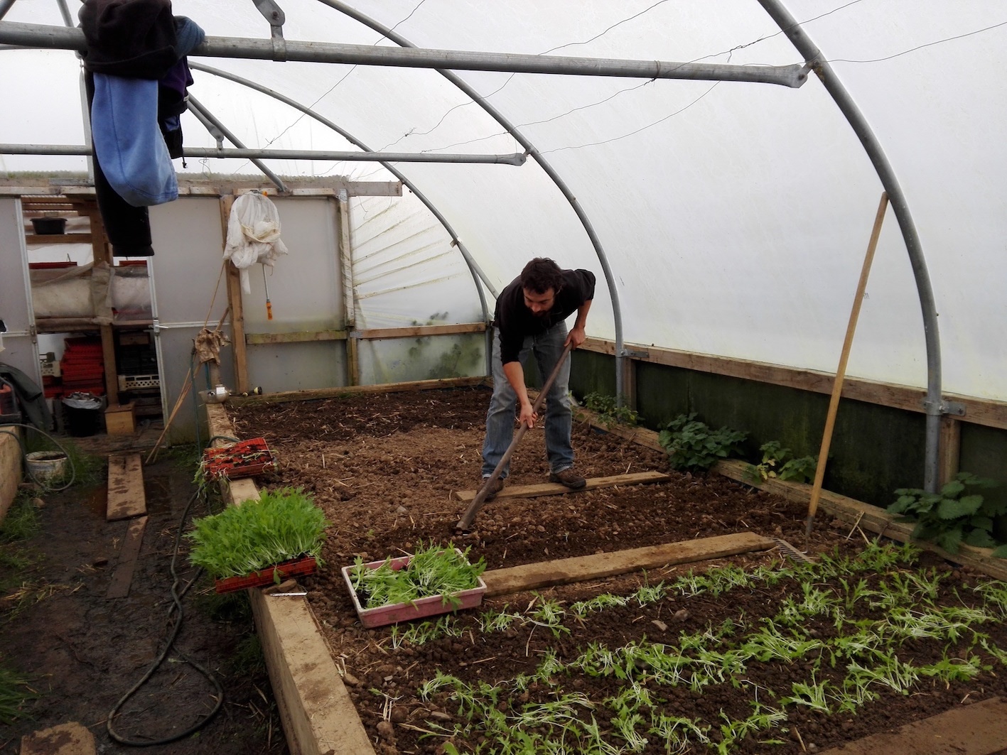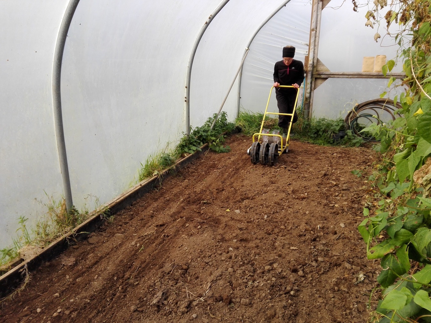 As a consequence of that seasonal shift in veggies, it’s been all change in both polytunnels. The french beans, peppers and tomato plants have all been removed, and the soil prepared and turned in both. The replanting has only just begun, with Poly 1 providing a new home for hundreds of freshly transplanted salad leaves, but with many many more to do. Meanwhile in Poly 2, ten lines of carrots have been planted, with cabbages and chards to follow shortly.