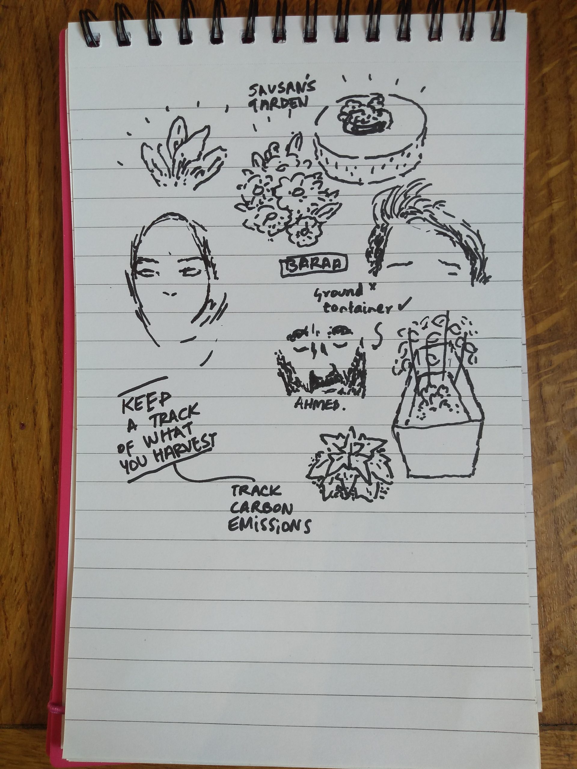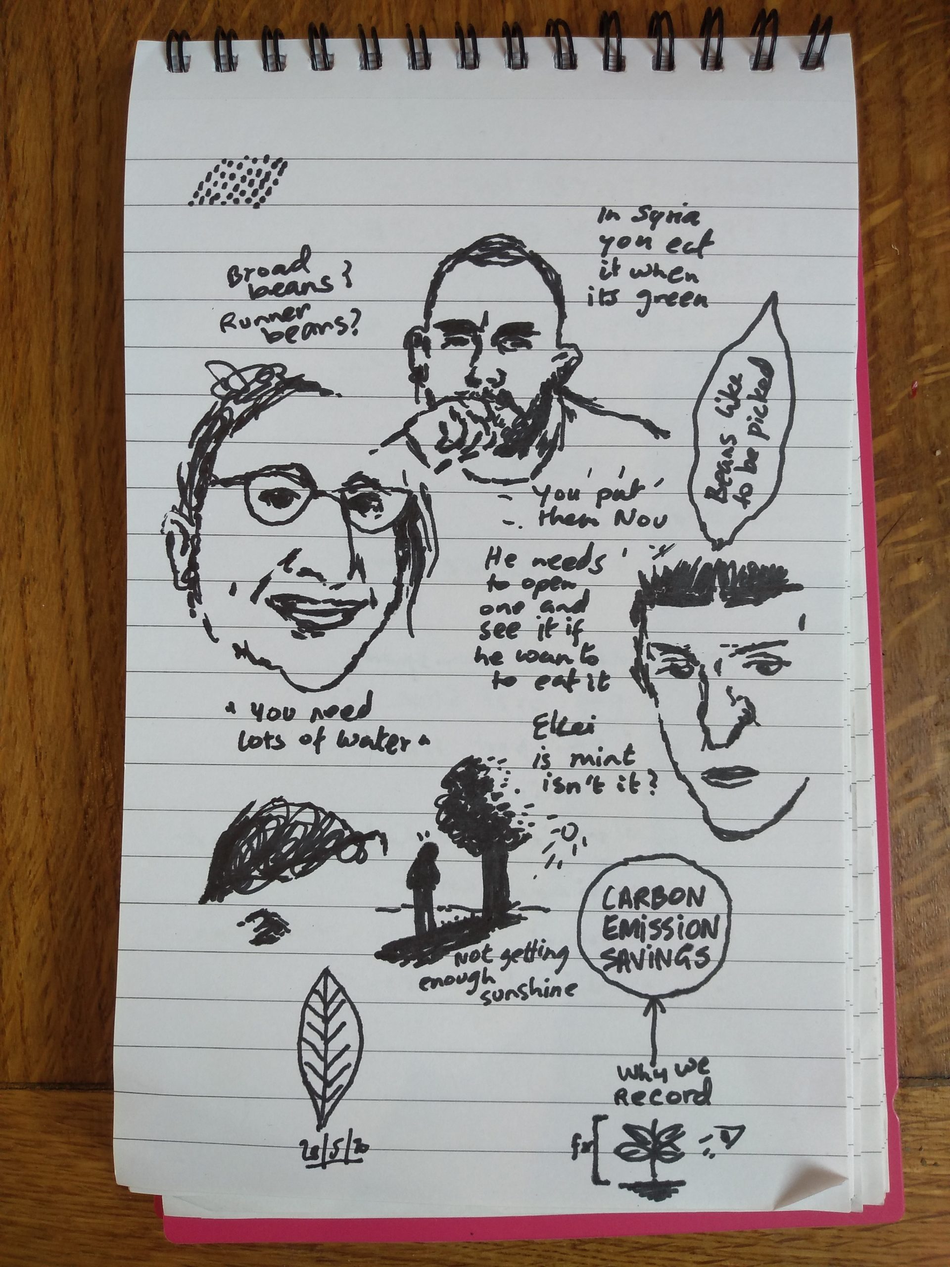 Online befriending through gardening group In May we hosted our first online befriending through gardening group. Befriending through gardening is a pilot programme in partnership with The Welcoming Association, which offers support to newly arrived Syrian families to grow food at home, promoting friendship opportunities with local volunteers through online meeting and advisory sessions. Our volunteer Aindri did some live doodles of the session and the things we talked about! Loving this creative approach to minute taking!